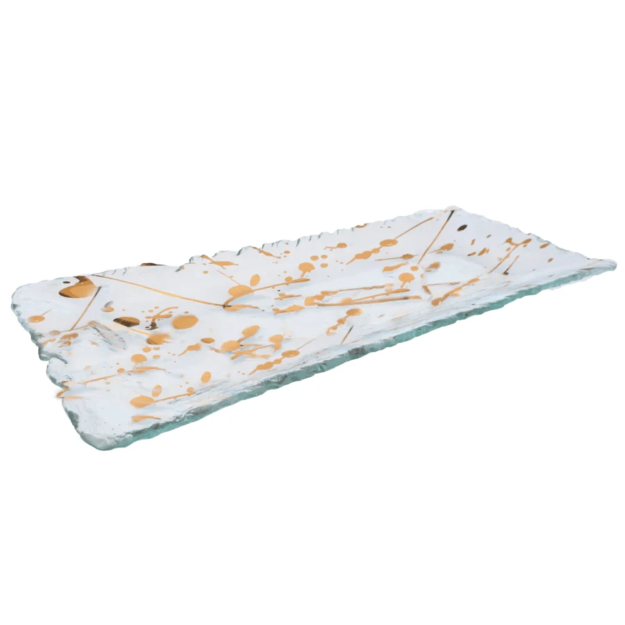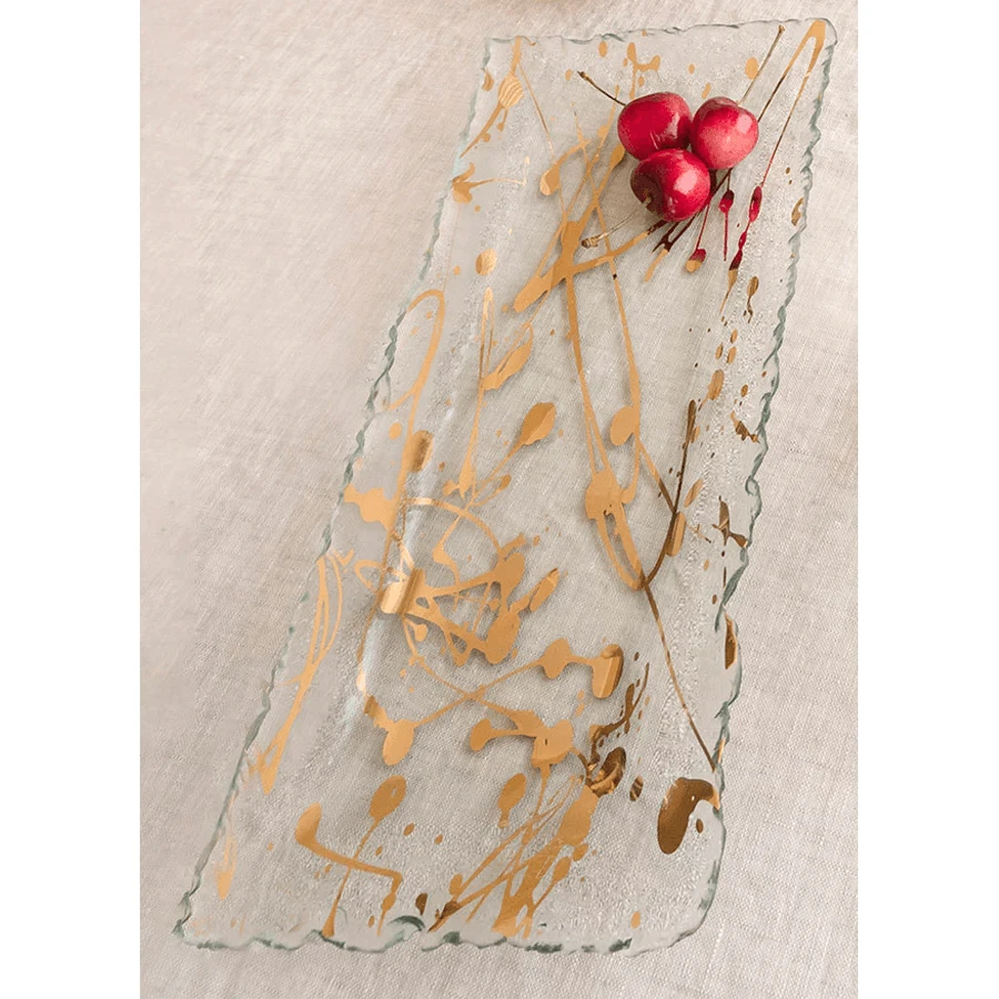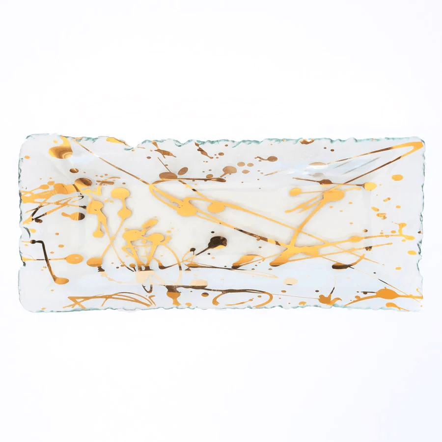 Artistic splashes of 24kt gold drip across this gorgeous rectangular-shaped glass appetizer tray. A collaboration between Annie and her artist son Taylor Reinhold. Affordable modern art.