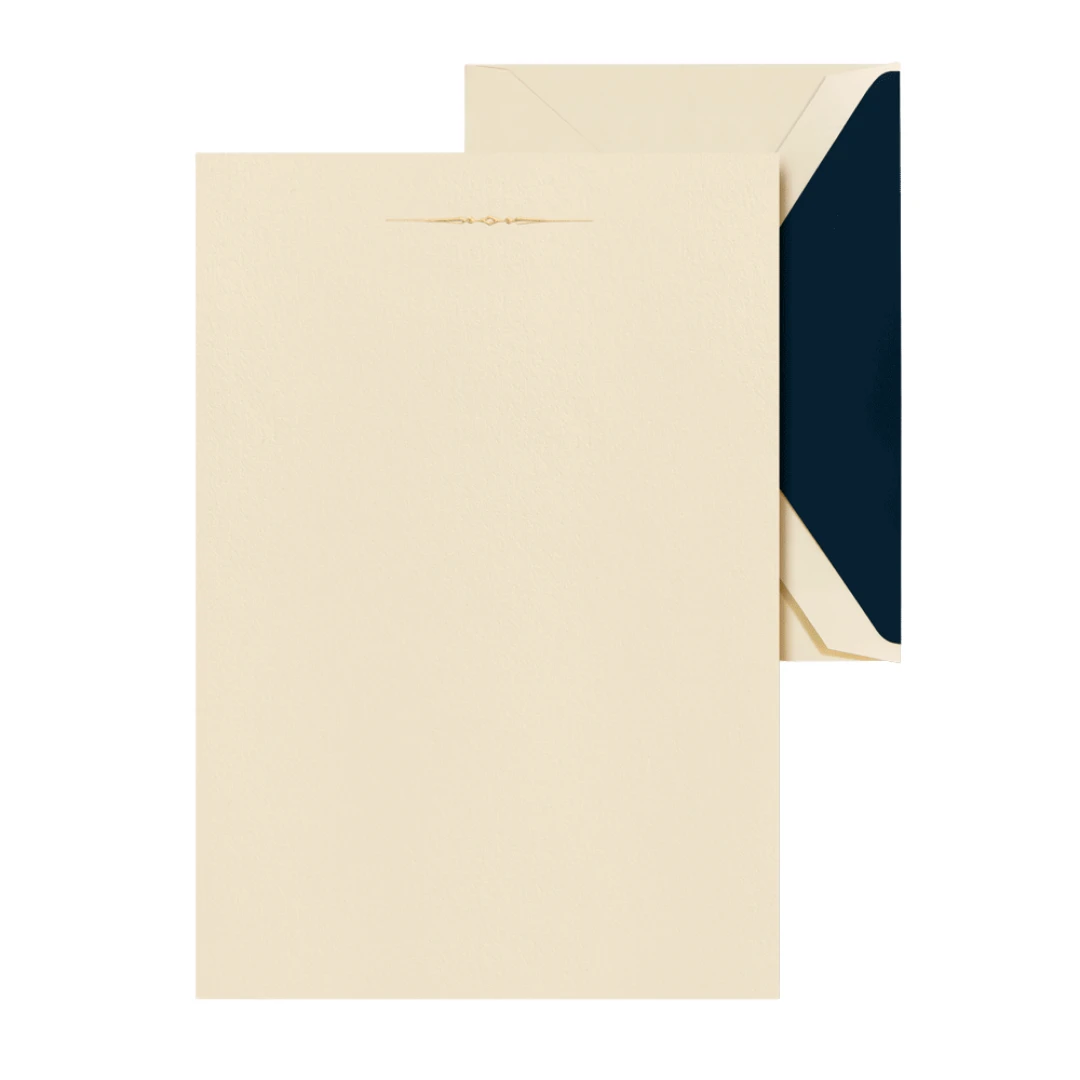Crane’s fine, all-cotton half sheets are just the right size for composing a thoughtful letter. Engraved at the top with a gold ornamental motif and lined in classic navy, this stationery set is just the thing to have on hand when inspiration strikes.