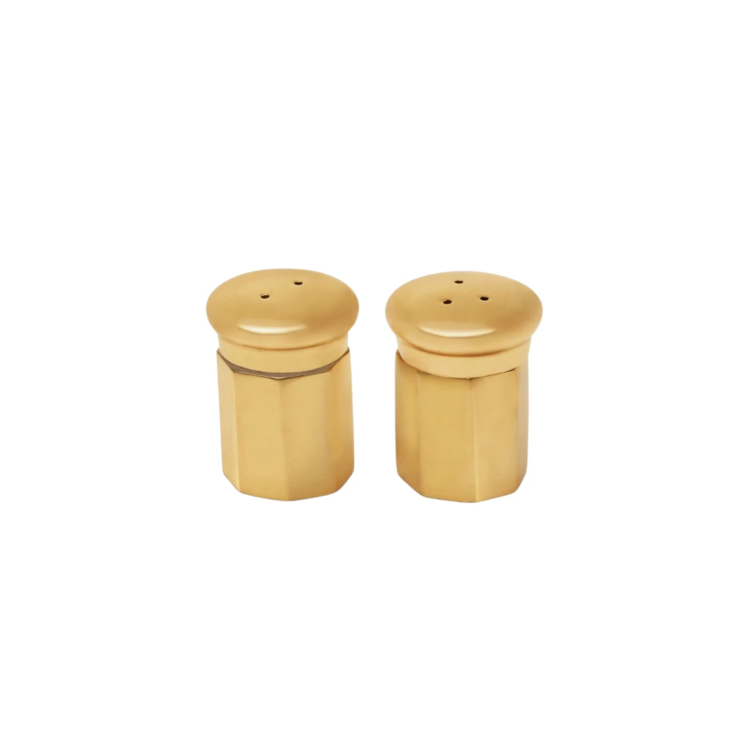 With round tops and faceted sides, this is the classic salt-and-pepper shaker set—but with a glamorous twist. Available in brass with a polished gold in either standard or mini sizes.