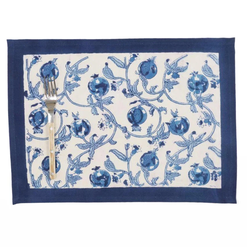 Featuring a delicately intertwined floral pattern with iconic royal blue pomegranates atop a white background