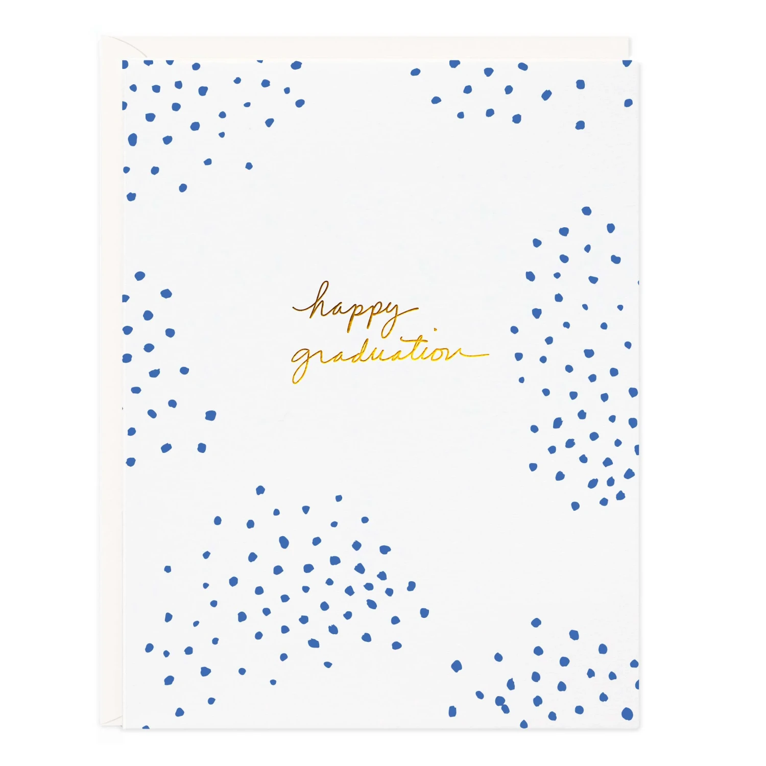 Happy little dots combine with hand lettering in gold accents to celebrate the new graduate.