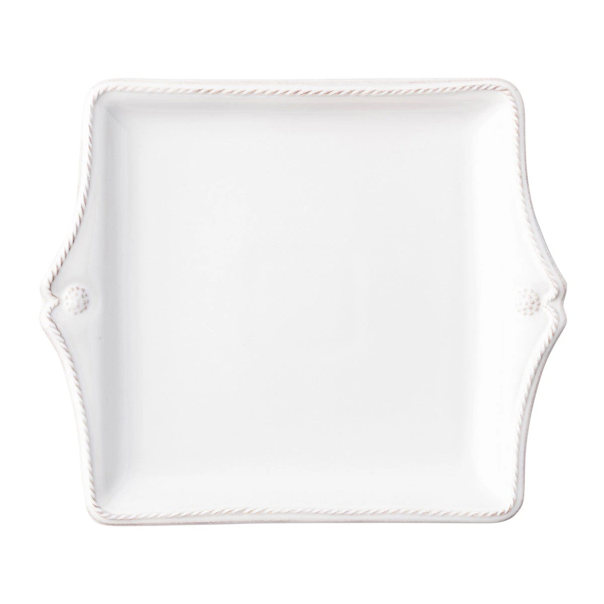 From Juliska’s Berry & Thread Collection- Rimmed with a simple thread and adorned with a sprinkling of berries, this iconic dinnerware collection embraces the historic motifs of Juliska’s Bohemian glassware. This square sweets tray, ideal for truffles or cookies, features two sculpted handles.
