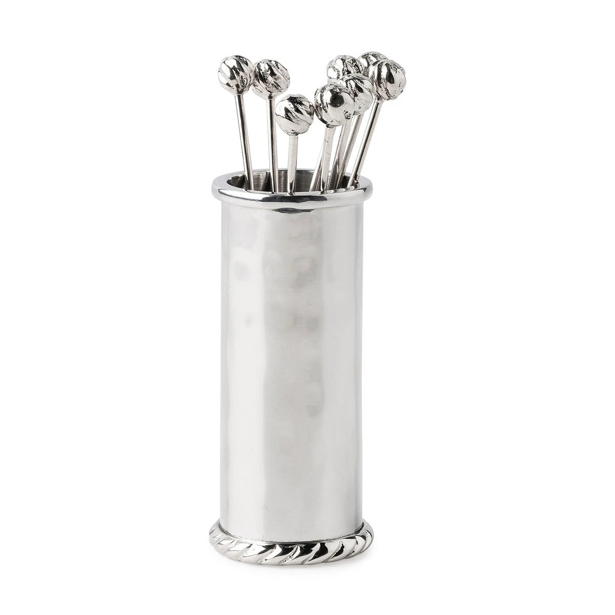 Decorated with a tidy trimming of simple thread, each piece in Juliska’s Graham barware collection is handmade in hammered stainless steel and polished to brilliance. This set of eight cocktail picks with accompanying holder works wonderfully for skewering a maraschino cherry or olive for your favorite craft cocktail. Each pick is adorned with a decorative finial.