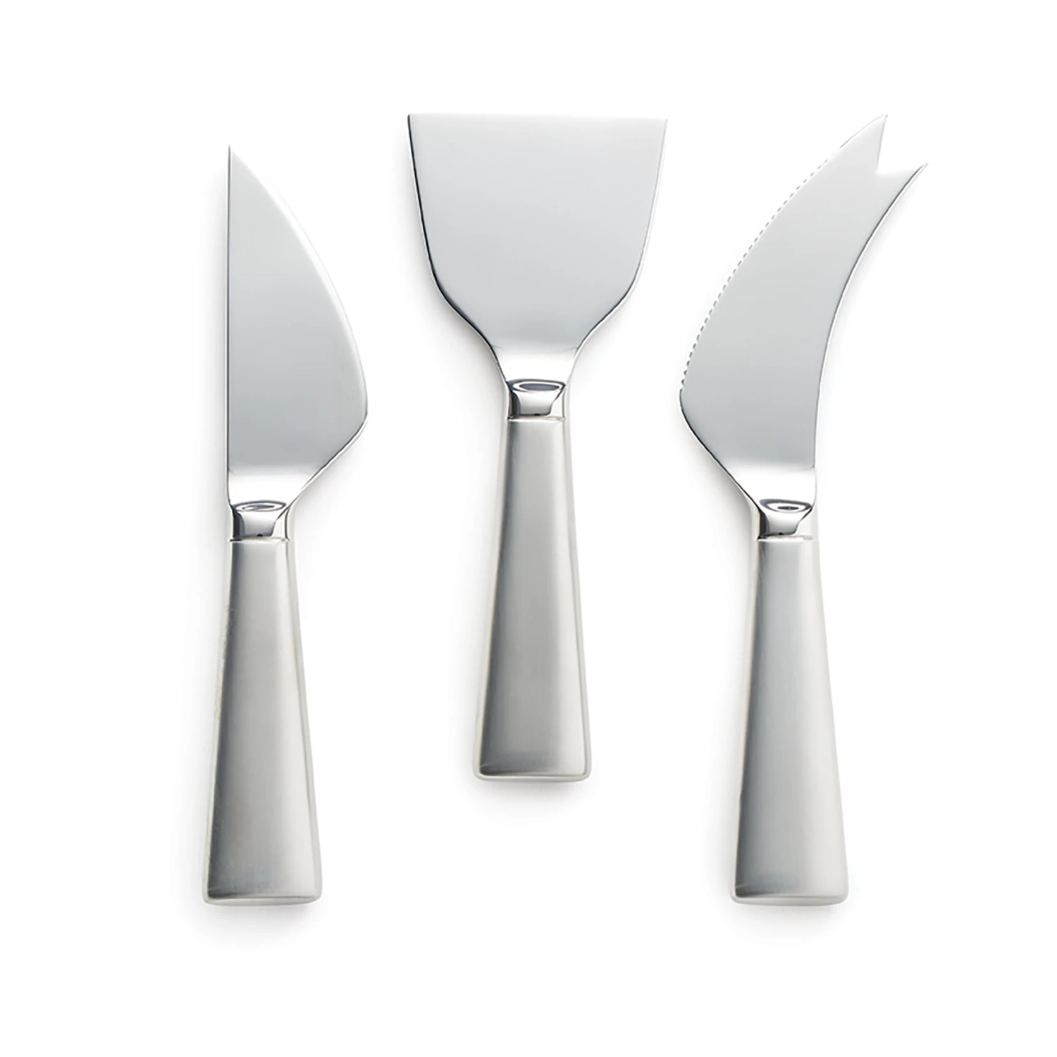 Simon Pearce’s stainless steel cheese knives coordinate with the Hartland flatware’s simple lines, contemporary brushed finish and hollow, lightweight construction. The set includes a fork-tipped spear for slicing and serving firm cheeses; a small spade to cut or chunk wedges of hard cheeses; and a flat cheese knife for crumbling soft cheese or shaving firmer cheeses.