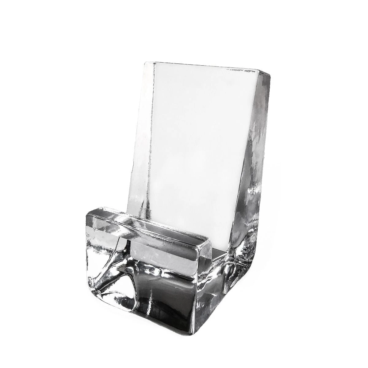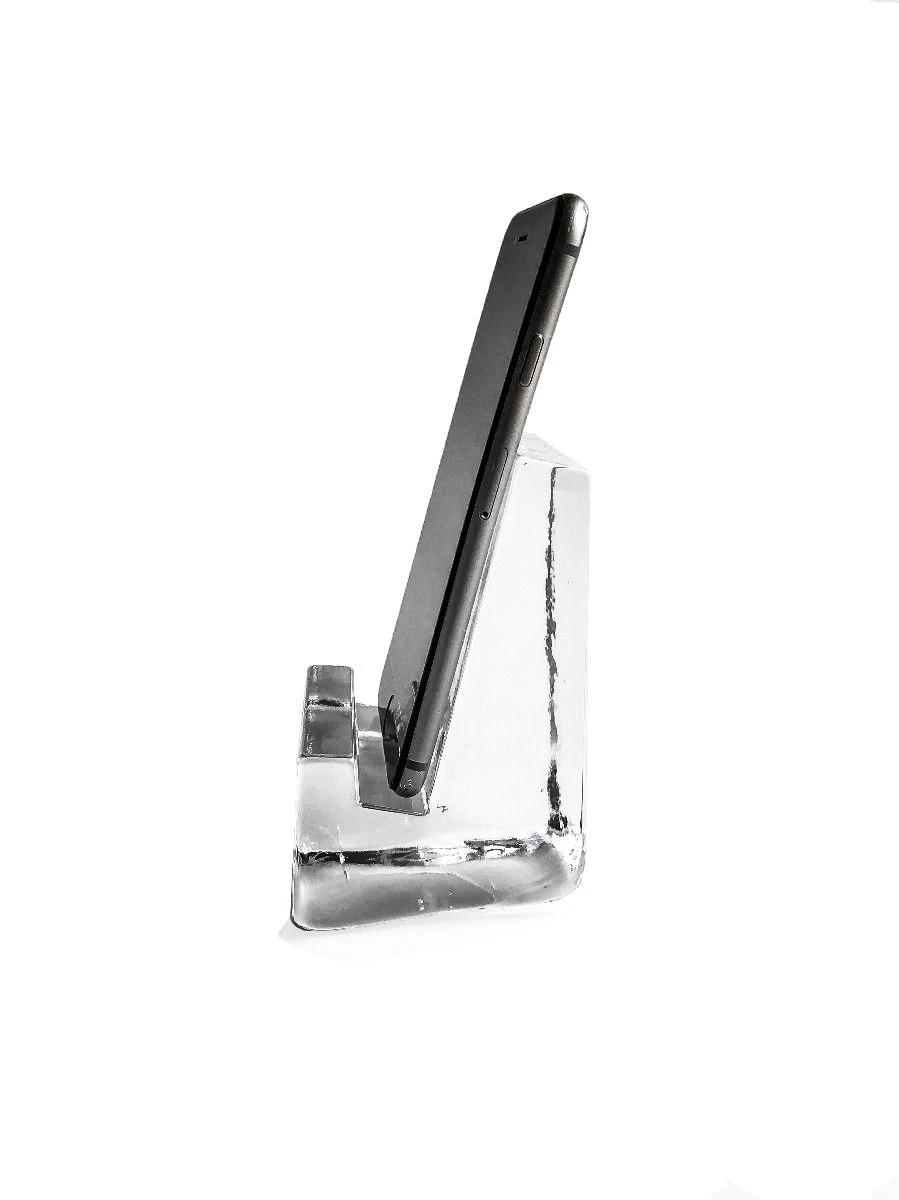 This handcrafted glass phone holder fits most mobile phones and tablets, making conference calls a pleasure, at your desk and beyond. It doubles a beautiful, functional kitchen assistant: keeping digital recipes on your device close at hand.