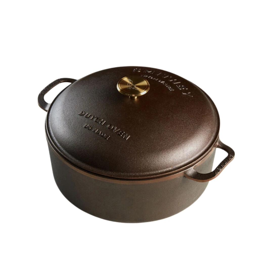 Smithey’s Dutch oven family continues to grow with the new 7.25 Quart Dutch Oven. Designed with a wide base that provides extra surface area for searing and browning meats or vegetables, this Dutch oven is perfect for slow cooking, frying, roasting, braising, and baking. The large capacity is ideal for cooking for families of 5 or more. Featuring Smithey’s signature polished interior surface that is naturally non-stick and easy-to-clean, this Dutch oven is complete with a surface finish that will never crack or chip – in fact, the interior surface will only get better with use. Crafted for versatility, we designed the lid of this Dutch oven to work as a custom-fit lid for your No. 12 Traditional Cast Iron Skillet for extra convenience. Use it well!