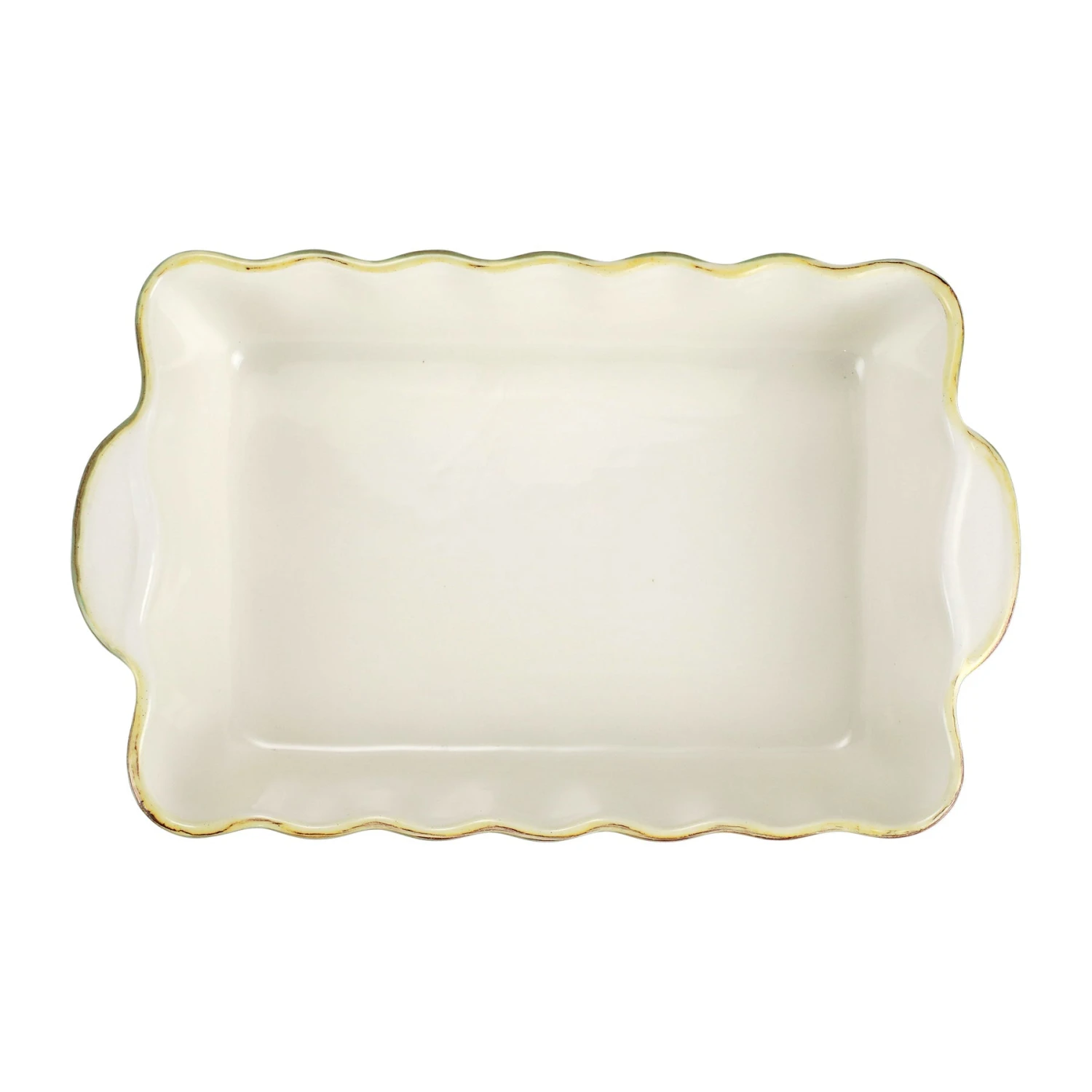 Featuring scalloped edges and an aqua hue, the Italian Bakers are handcrafted of Italian stoneware in Umbria. This unique size and fun shape is perfect for gatherings and family get-togethers.